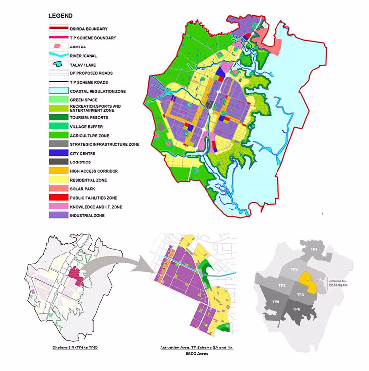 TP schemes are being implemented under the Gujarat Town Planning and Urban Development Act, 1976 (GTPUD) The developable area in DSIR is divided into six (6) Town Planning (TP) Schemes and all six draft schemes have been sanctioned. Town Planning Schemes 1 and 2 cover the development in Phase-I. TP 1 is spread over approximately 51 sq km or 12,750 acres, and TP 2 is over 102 sq km or 25,000 acres.